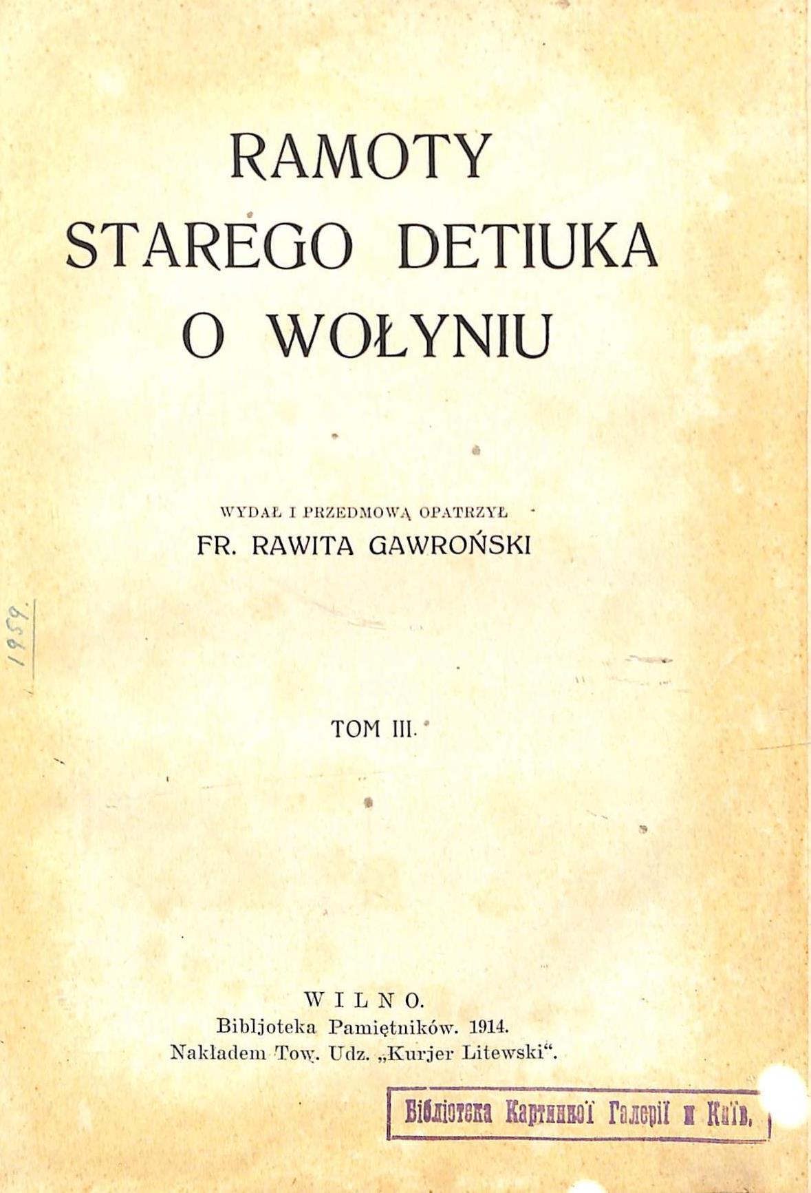 Andrzejowski, A. Ramoty starego Detiuka o Wolyniu [Електронна копія]. Т. 3 / Antoni Andrzejowski ; wydał i przedmowa opatrzyl Fr. R. Gawronski. – Wilno : Nakladem Tow. Udz. «Kurjer Litewski» (Druk Jozefa Zawadzkiego). – 234 с. : портр. – (Bibljoteka Pamietnikow).