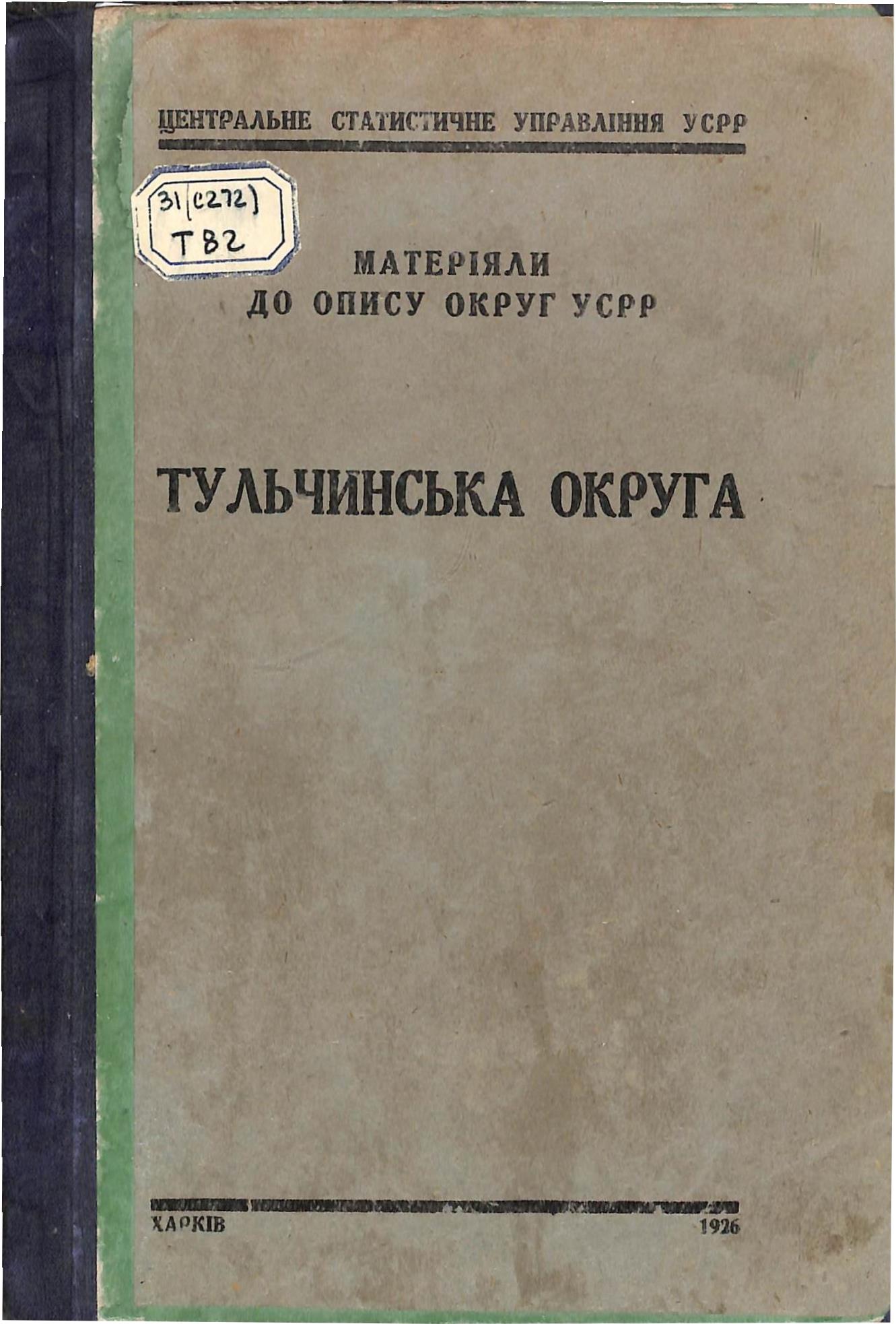 Матеріяли до опису округ УСРР : Тульчинська округа [Електронна копія] / Центр. стат. управління УСРР. – Харків : Центр. стат. управління УСРР, 1926. – VIII, 56 с. : табл.