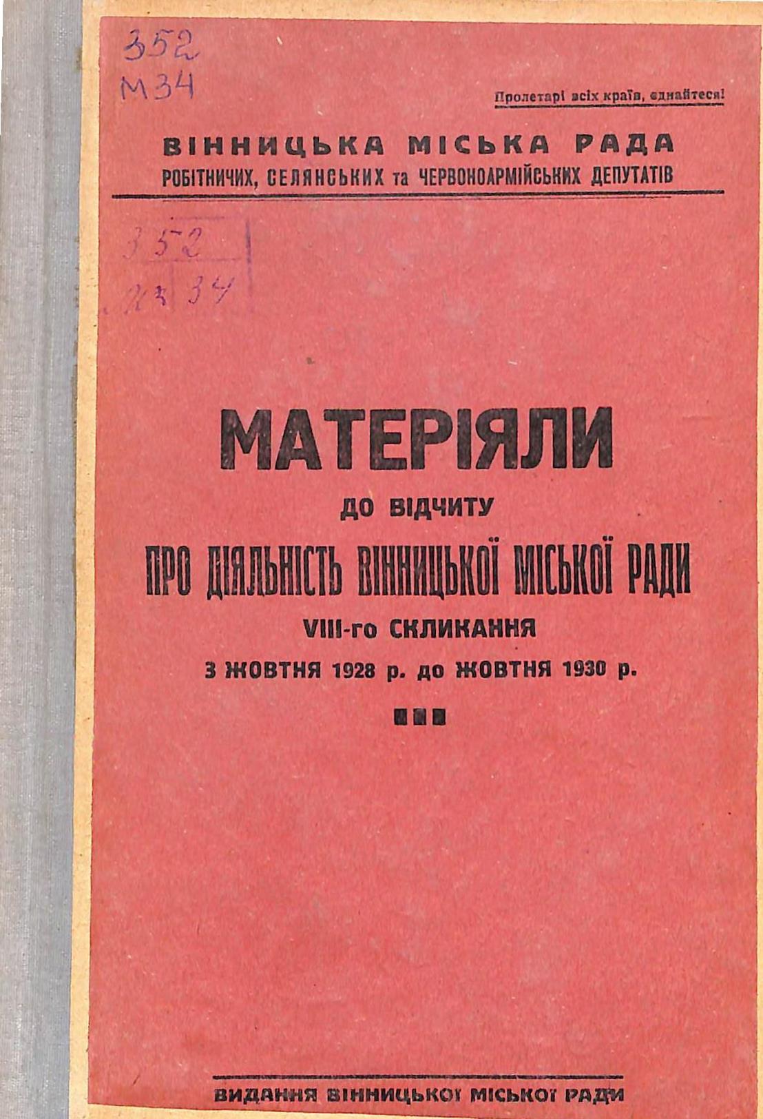 Матеріяли до відчиту про діяльність Вінницької міської ради VIII скликання з жовтня 1928 р. до жовтня 1930 р. [Електронна копія] / Вінницька міська рада робітничих, селянських та червоноармійських депутатів. – Вінниця : Вид. Вінницької міської ради (Вінницька друк. ім. Леніна), 1930. – 58 с. : табл.