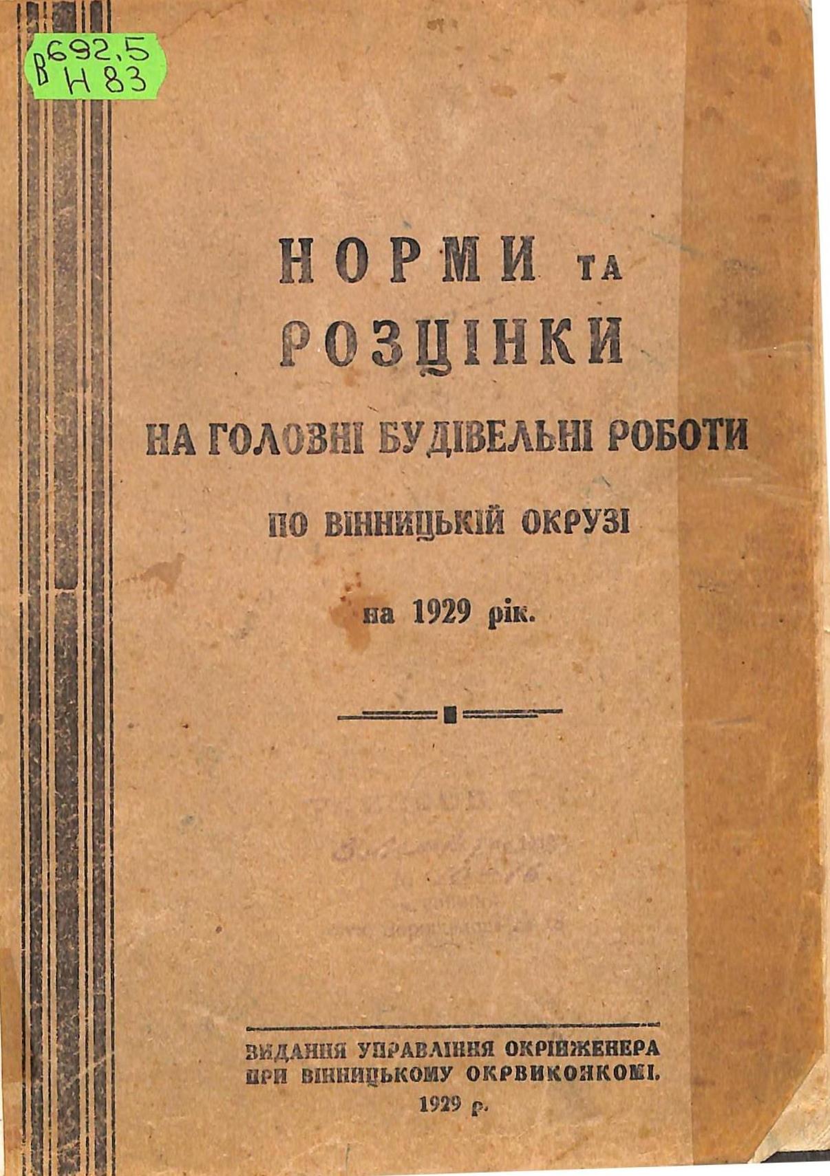 Норми та розцінки на головні будівельні роботи по Вінницькій окрузі на 1929 рік [Електронна копія] / Управління округового інженера при Вінницькому округовому виконавчому комітеті. – Вінниця : Видання упр. Окрінженера при Він. Окрвиконкомі (Жмеренка : «Червоний друкар»), 1929. – 106 с. : табл.