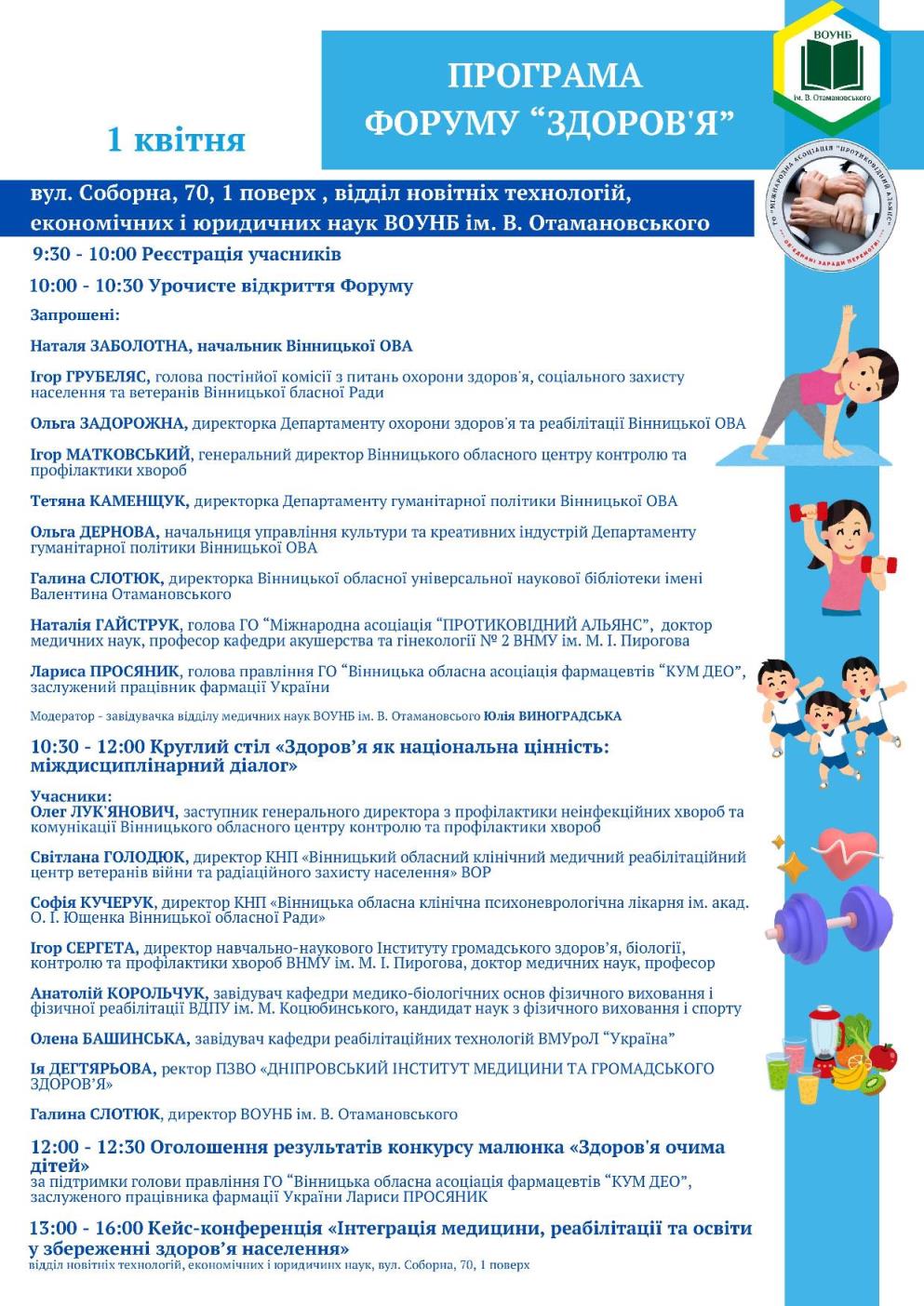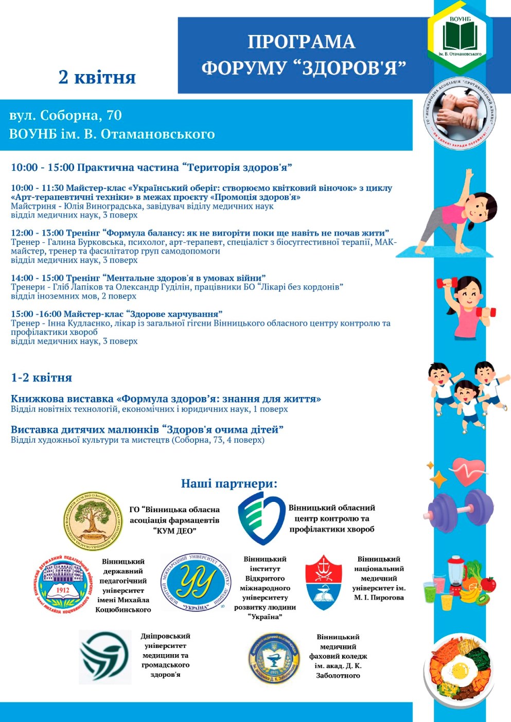 1–2 квітня 2026 року у Вінницькій обласній універсальній науковій бібліотеці імені Валентина Отамановського відбудеться форум «Здоров’я», присвячений формуванню культури здоров’я у громаді, розвитку міждисциплінарної співпраці та популяризації здорового способу життя серед молоді.