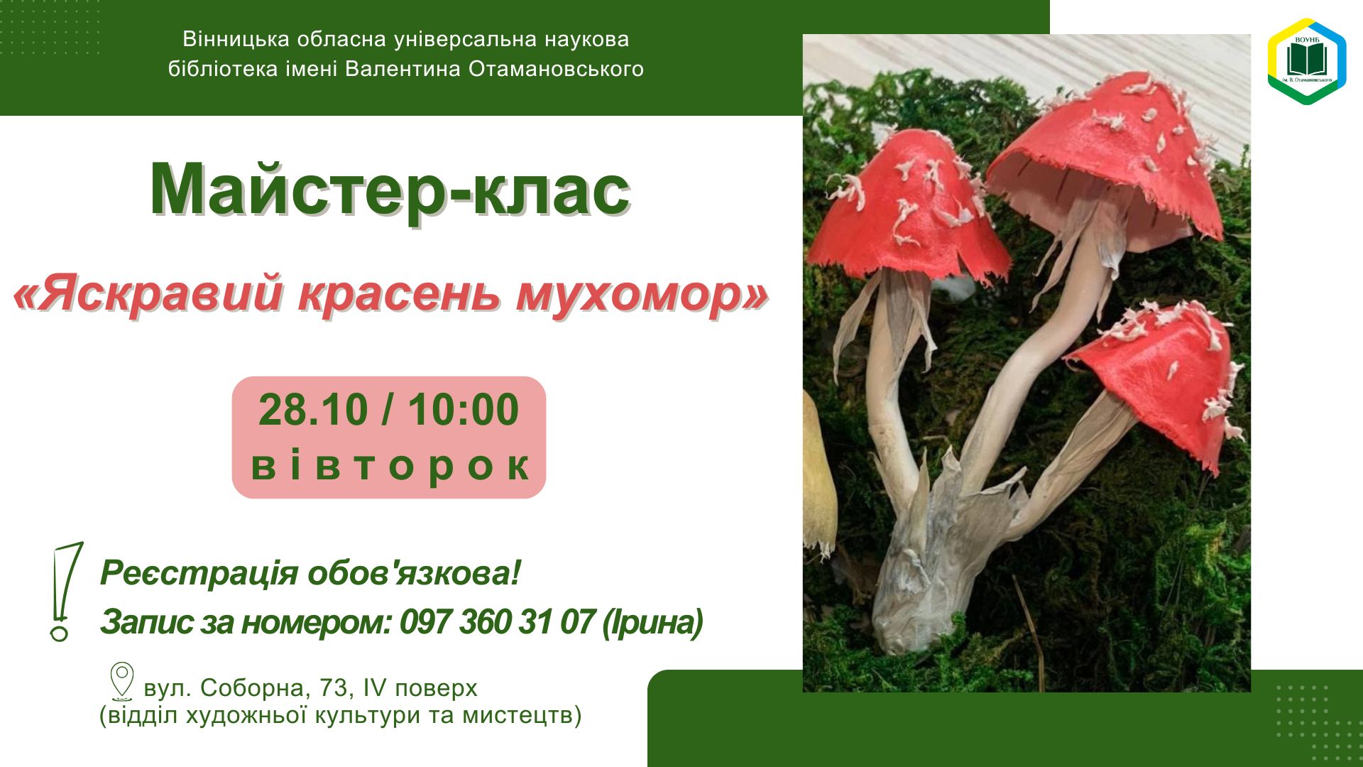 28 жовтня у відділі культури та мистецтв ВОУНБ ім. В.Отамановського в рамках роботи студії творчості «Усе підвладно руці майстра» пройде майстер-клас виготовлення прикраси «Яскравий красень мухомор» для ВПО та вінничан.