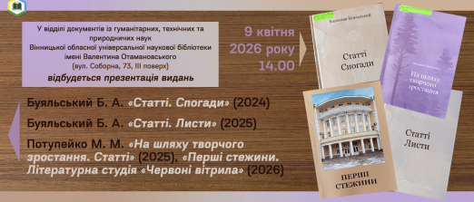 Презентація книг Б. Буяльського «Статті. Спогади», «Статті. Листи», М. Потупейка «На шляху творчого зростання» та збірки «Перші стежини» (упорядник – письменник Віктор Мельник)