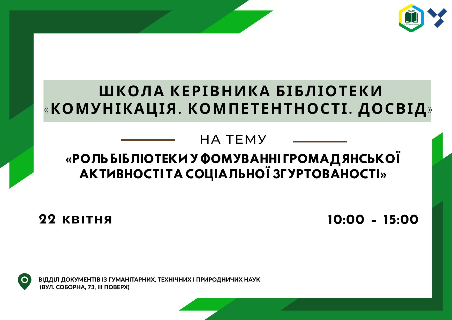 Школа керівника бібліотеки «Комунікація. Компетентності. Досвід» на тему «Роль бібліотеки у формуванні громадянської активності та соціальної згуртованості»