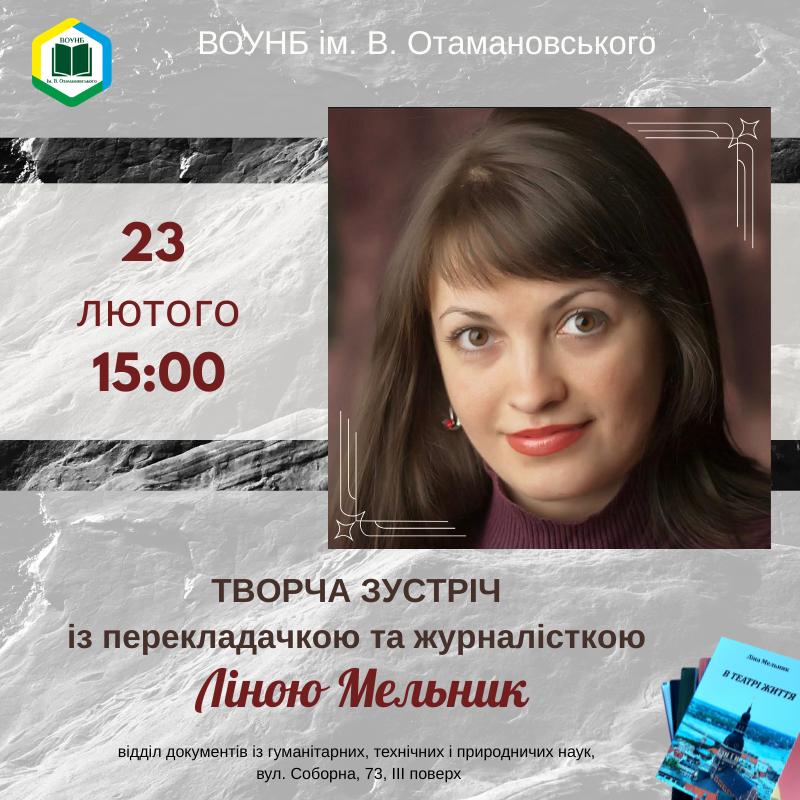 23 лютого 2026 року о 15:00 у читальній залі відділу документів із гуманітарних, технічних та природничих наук Вінницької обласної універсальної наукової бібліотеки імені Валентина Отамановського (вул. Соборна, 73, III поверх) відбудеться творча зустріч із перекладачкою та журналісткою Ліною Мельник.