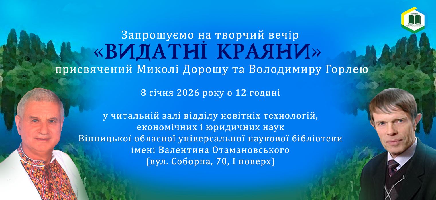 8 січня 2026 року о 12 годині у читальній залі відділу новітніх технологій, економічних і юридичних наук Вінницької обласної універсальної наукової бібліотеки імені Валентина Отамановського (вул. Соборна, 70, І поверх) відбудеться творчий вечір «Видатні краяни» присвячений Миколі Дорошу та Володимиру Горлею.