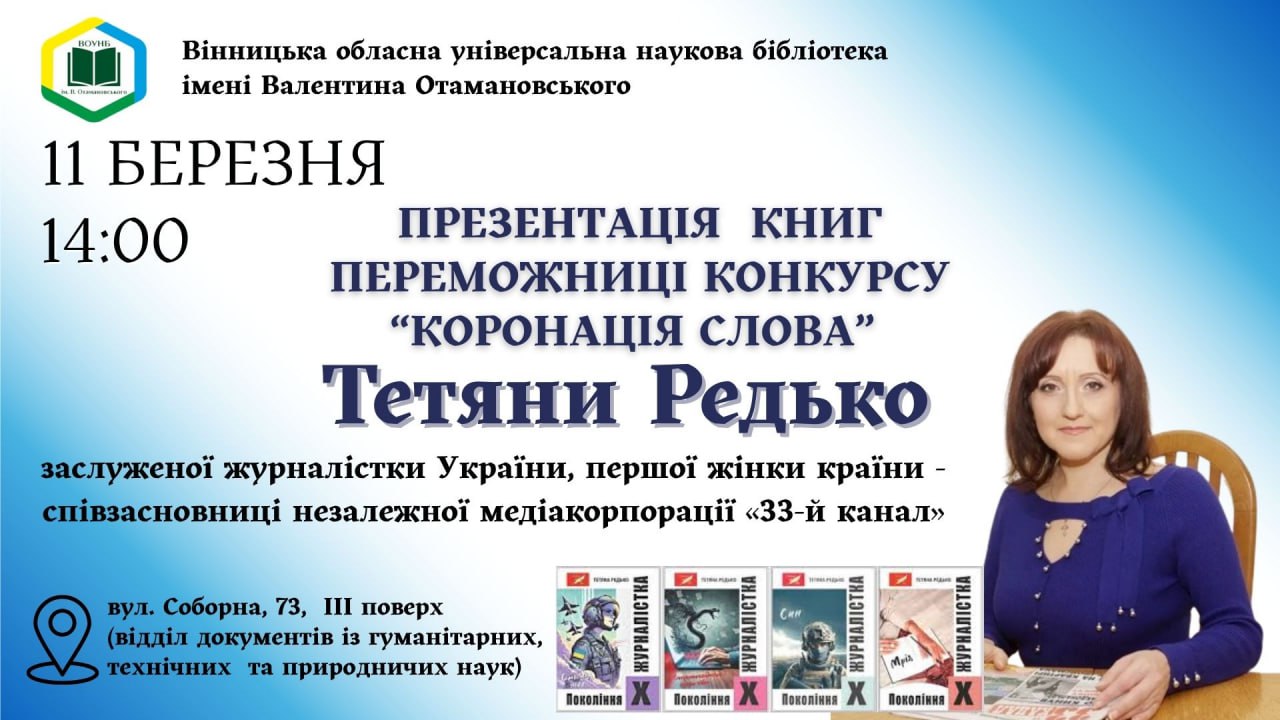 11 березня о 14:00 у читальній залі відділу документів із гуманітарних, технічних та природничих наук Вінницької обласної універсальної наукової бібліотеки імені Валентина Отамановського (вул. Соборна, 73, ІІІ поверх) відбудеться особлива подія для всіх шанувальників сучасної української літератури – творча зустріч із переможницею престижного конкурсу «Коронація слова», письменницею, заслуженою журналісткою України та співзасновницею незалежної медіакорпорації «33-й канал» – Тетяною Редько.