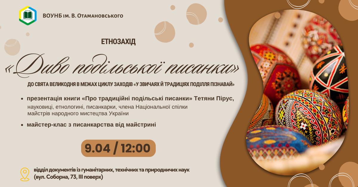 До свята Великодня у ВОУНБ ім. В. Отамановського 9 квітня в межах циклу народознавчих заходів «У звичаях й традиціях Поділля пізнавай» відбувся етнозахід «Диво подільської писанки». Участь в етнозаході взяли жінки і дівчата, зокрема з родин військовослужбовців, Вищого професійного училища № 11 м. Вінниці, працівники Вінницького державного центру естетичного виховання учнів професійно-технічних навчальних закладів та працівники бібліотеки.