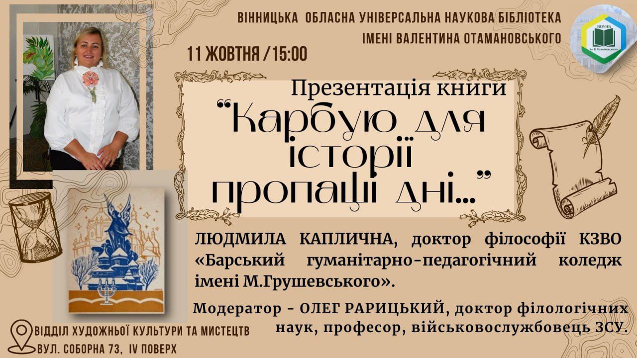 11 жовтня о 15:00 у відділі художньої культури та мистецтв відбудеться презентація книги Людмили Капличної «Карбую для історії пропащі дні» до 115-річчя від дня народження Олекси Несторовича Гай-Головка.