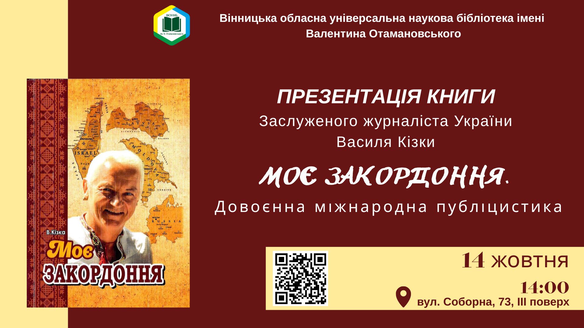 14 жовтня 2025 року о 14:00 у читальній залі відділу документів із гуманітарних, технічних та природничих наук Вінницької обласної універсальної наукової бібліотеки імені Валентина Отамановського (вул. Соборна, 73, III поверх) відбудеться презентація книги Василя Кізки «Моє закордоння. Довоєнна міжнародна публіцистика».