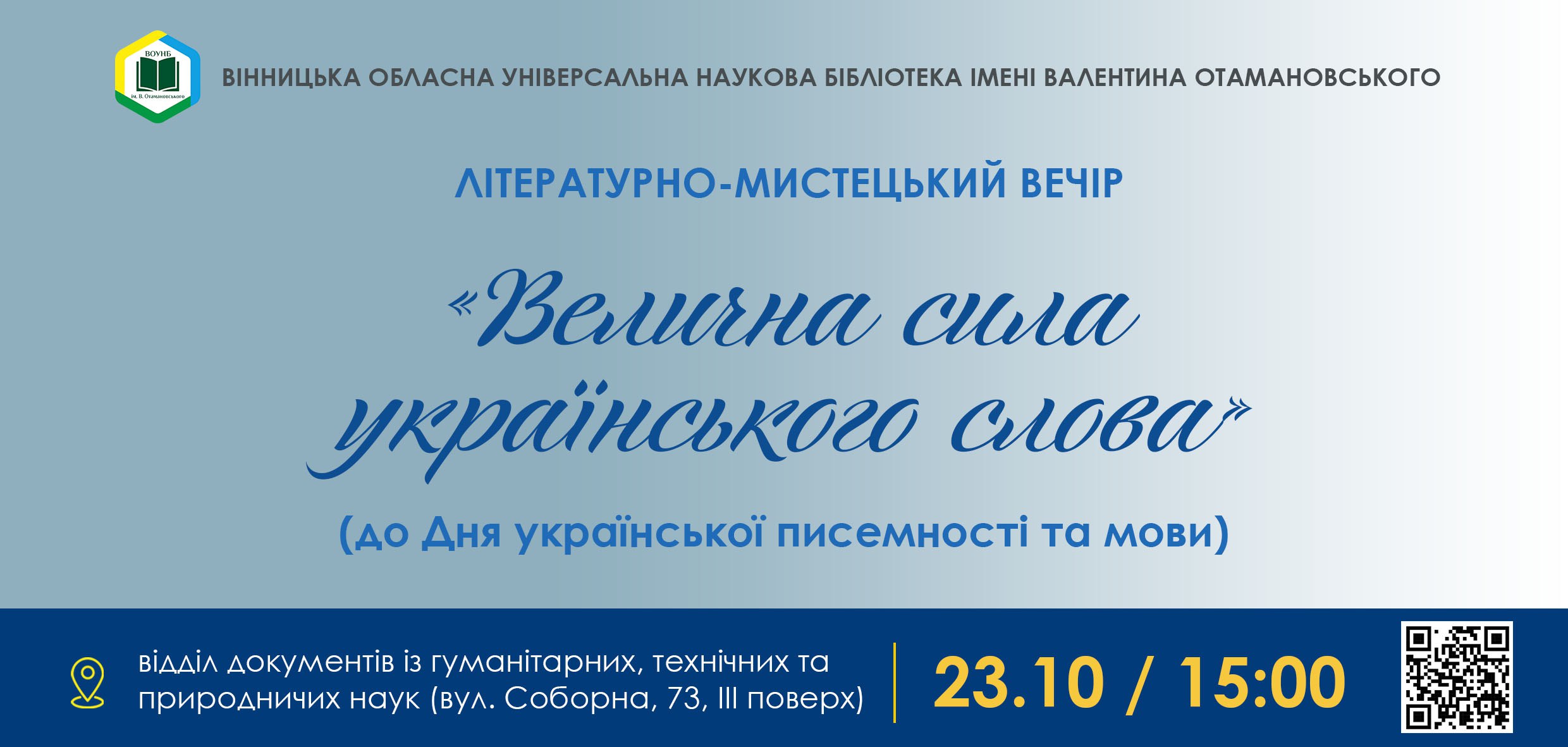 23 жовтня 2025 року о 15 годині у Вінницькій обласній універсальній науковій бібліотеці імені Валентина Отамановського традиційно до Дня української писемності та мови відбудеться літературно-мистецький вечір «Велична сила українського слова». Захід проходитиме у читальній залі відділу документів із гуманітарних, технічних та природничих наук (вул. Соборна, 73, ІІІ поверх, наявні сходи). Перекладу жестовою мовою на даній події не буде.