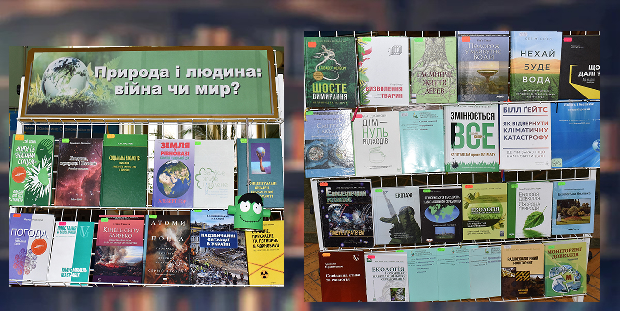 З нагоди цих днів відділ документів із гуманітарних, технічних та природничих наук підготував виставку-застереження «Природа і людина: війна чи мир?». Експозиція зосереджена на одній із ключових проблем сучасності – непростих і суперечливих стосунках між людством і довкіллям.