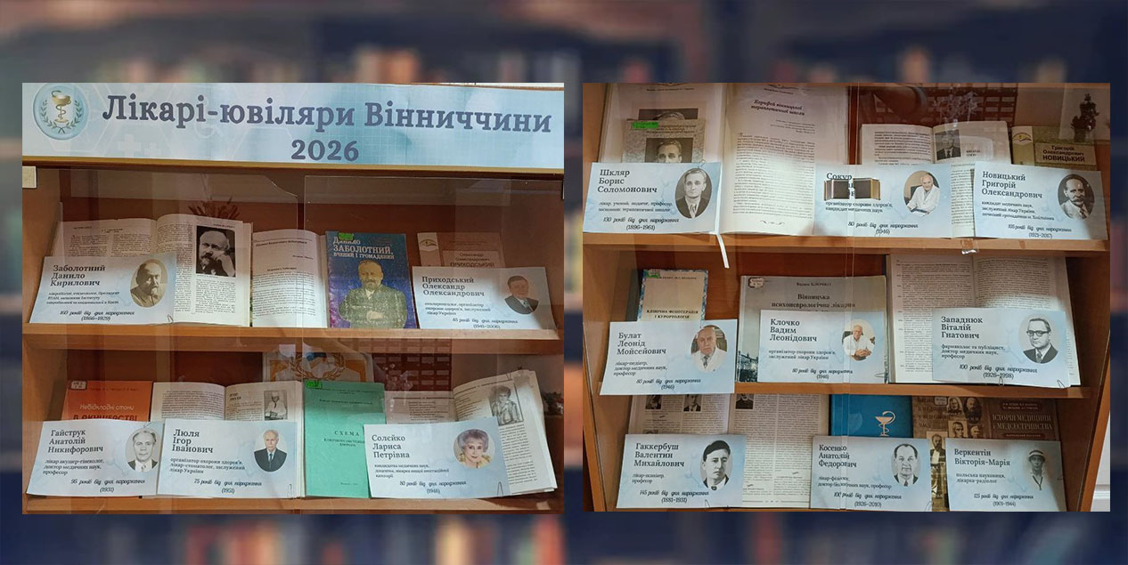У відділі медичних наук ВОУНБ ім. В. Отамановського представлено книжкову виставку «Лікарі-ювіляри Вінниччини 2026 року», присвячену видатним лікарям і науковцям-медикам – уродженцям краю, а також тим, хто працював на Вінниччині. На експозиції демонструються матеріали про їхній життєвий шлях, професійні здобутки та внесок у розвиток вітчизняної медицини.