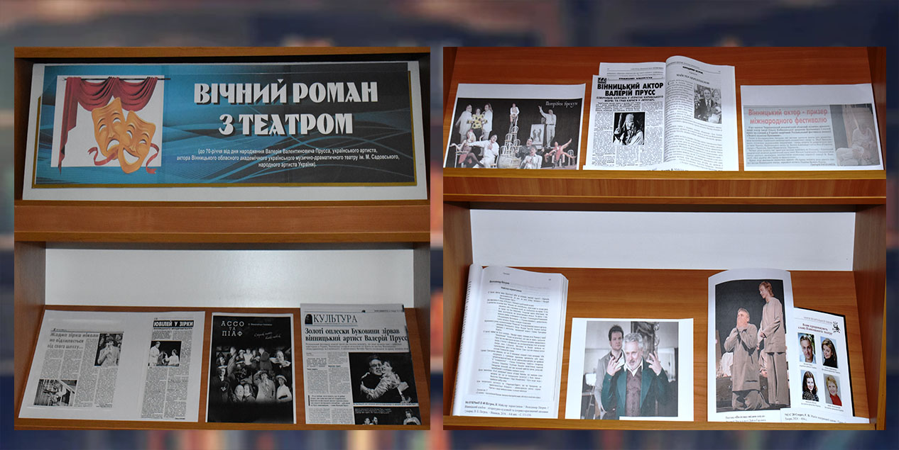 З нагоди 70-річчя від дня народження Валерія Валентиновича Прусса, українського артиста, актора Вінницького обласного академічного українського музично-драматичного театру ім. М. Садовського, народного артиста України відділ художньої культури та мистецтв підготував ювілейну виставку «Вічний роман з театром».
