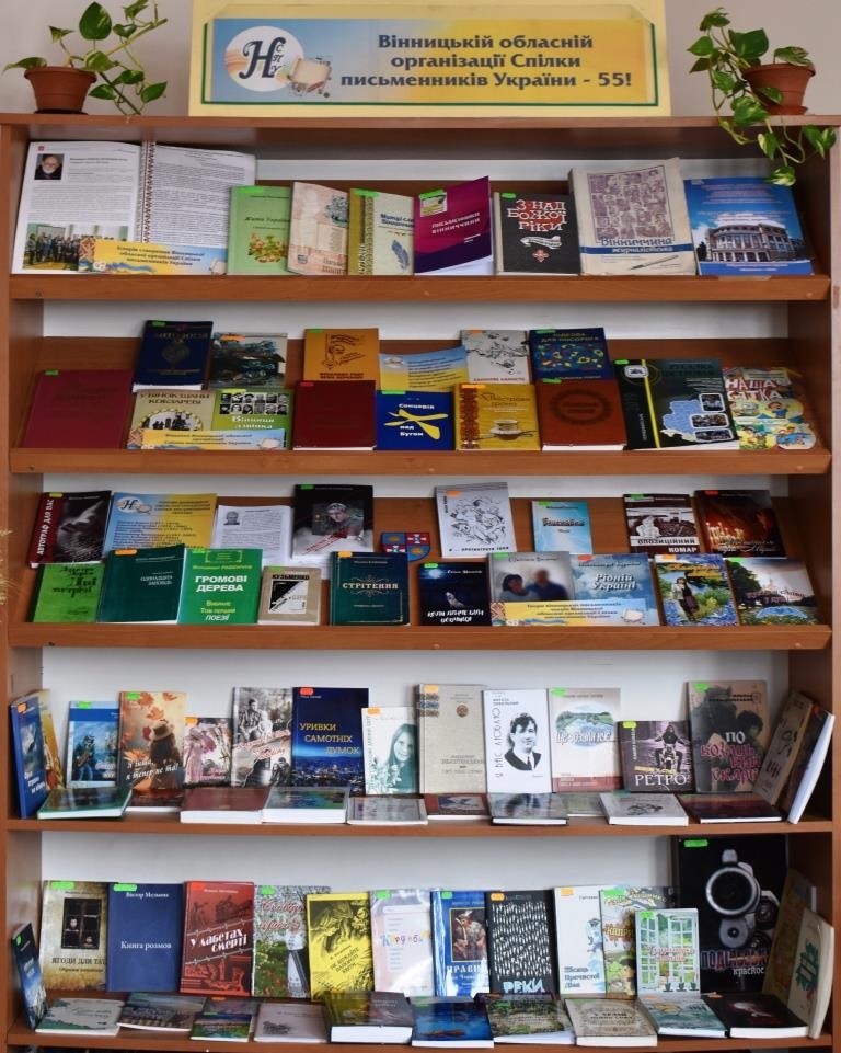 Висвітлюючи історію створення Вінницької обласної організації Національної спілки письменників України відділ краєзнавства підготував для користувачів бібліотеки книжкову виставку «Вінницькій обласній організації Спілки письменників України – 55!».