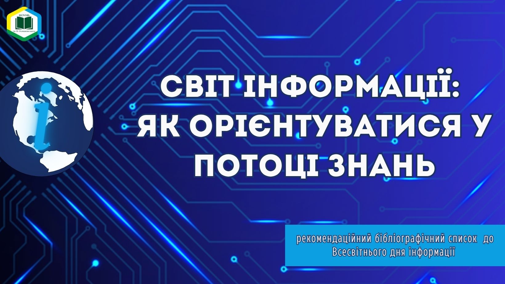 З нагоди Всесвітнього дня інформації відділ наукової інформації та бібліографії підготував віртуальний рекомендаційний список «Світ інформації: як орієнтуватися у потоці знань». Сьогодні наше суспільство живе в умовах, де інформація є фундаментом для прийняття рішень, розвитку технологій і формування особистості. Вона відіграє вирішальну роль у передачі знань, впливає на громадську думку та торкається кожної сфери нашого існування – від професійної діяльності до щоденного спілкування. У сучасному світі, переповненому даними, доступ до якісної, перевіреної та актуальної інформації набув критичного значення.