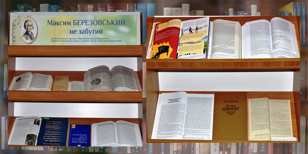 До 280-річчя від дня народження Максима Созонтовича Березовського, українського композитора, диригента, скрипаля, співака, класика європейської музики, у відділі художньої культури та мистецтв представлено книжково-ілюстративну виставку «Максим Березовський не забутий».