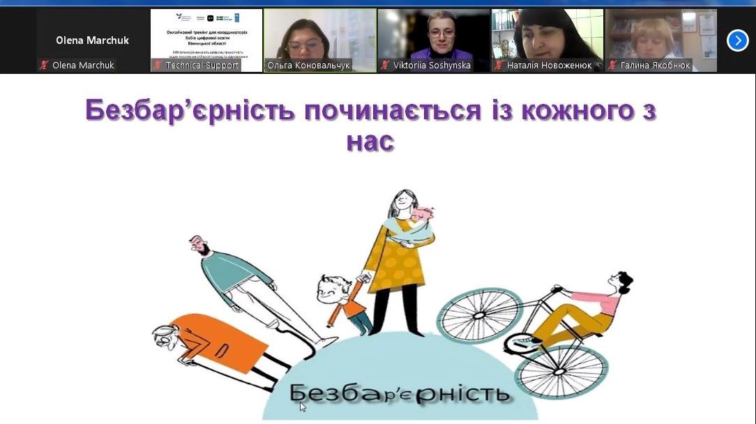 Під час навчального дня заступниця директора з основної діяльності Ольга Коновальчук ознайомила учасників із ключовими поняттями безбар’єрного середовища, розповіла про види комунікацій, що сприяють залученню кожного, незалежно від віку, стану здоров’я чи соціального статусу, а також представила низку сучасних цифрових ресурсів.