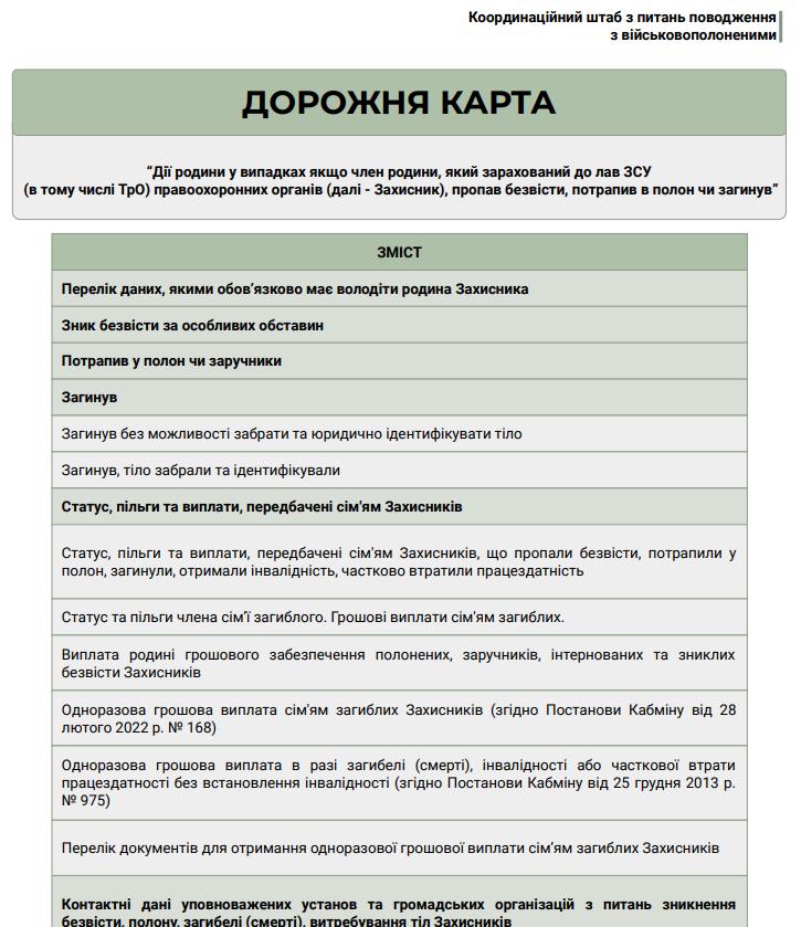 Дорожня карта. «Дії родини у випадках якщо член родини, який зарахований до лав ЗСУ (в тому числі ТрО) правоохоронних органів (далі – Захисник), пропав безвісти, потрапив в полон чи загинув» [Електронний ресурс] / Координаційний штаб з питань поводження з військовополоненими. – Текст. і граф. дані. – Режим доступу: https://ombudsman.gov.ua/storage/app/media/Новини/Doroznya_karta_koordenaciynuy-chtab.pdf (дата звернення: 09.10.2025). – Назва з екрана.
