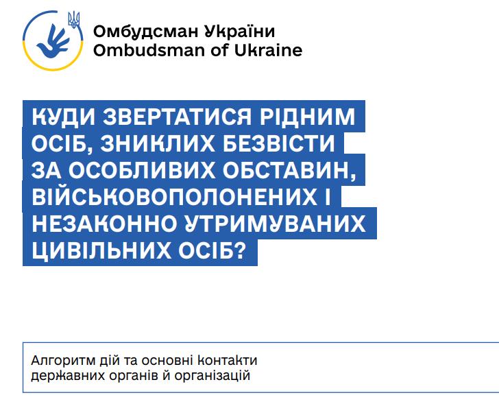 Куди звертатися рідним осіб, зниклих безвісти за особливих обставин,військовополонених і незаконно утримуваних цивільних осіб? : посібник // Уповноважений Верховної Ради України з прав людини. – Текст. і граф. дані. – Режим доступу: https://ombudsman.gov.ua/storage/app/media/uploaded-files/pamyatka.pdf (дата звернення: 09.10.2025). – Назва з екрана.