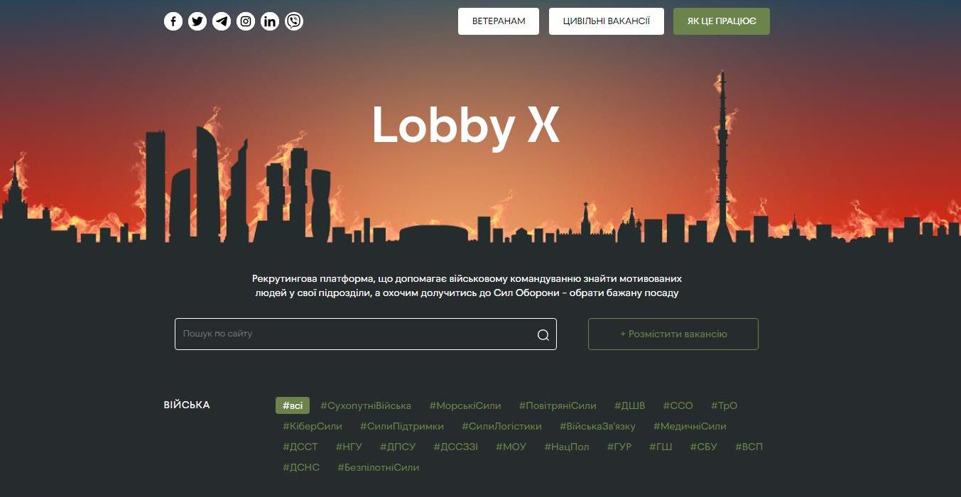 LobbyX – це спеціалізована рекрутингова платформа для Збройних сил України та Сил оборони, де командири публікують вакансії, а кандидати обирають бажані посади та підрозділи. Платформа дозволяє уникнути випадкового розподілу через ТЦК, пропонуючи вибір серед бойових, медичних, ІТ та інших спеціальностей. Платформа інтегрована з «Дією», Резерв+, Шлях до війська починається тут та іншими сервісами для зручного рекрутингу.