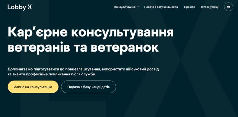 Розділ Ветеранам присвячений кар'єрному консультуванню для ветеранів та ветеранок від соціального підприємства Lobby X, яке спеціалізується на рекрутингу в Сили безпеки та оборони.