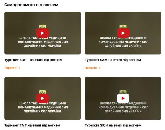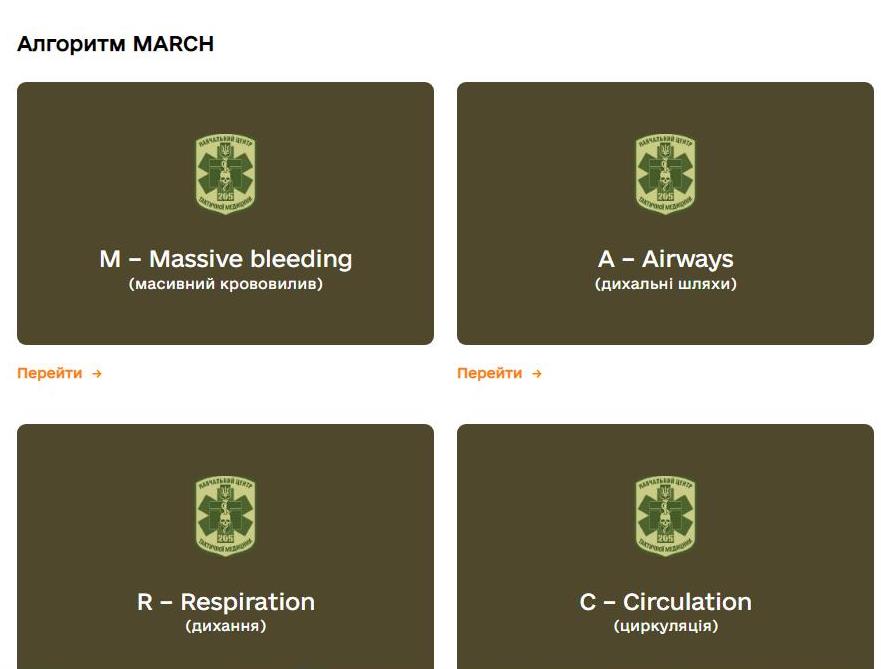 - Розділ пропонує практичні відеоуроки за стандартами MARCH/TCCC: