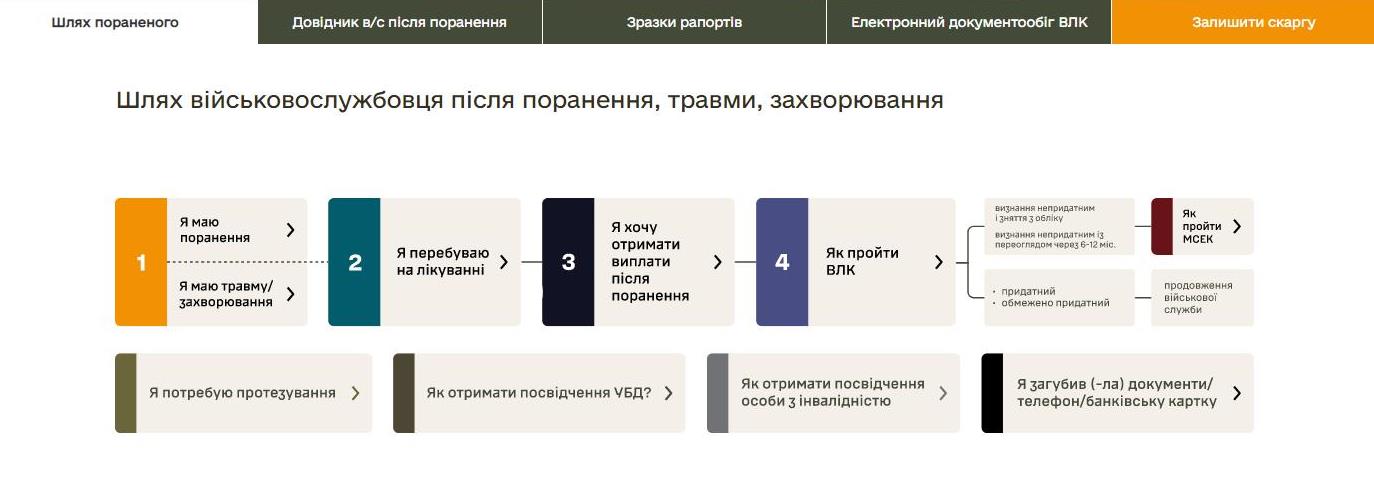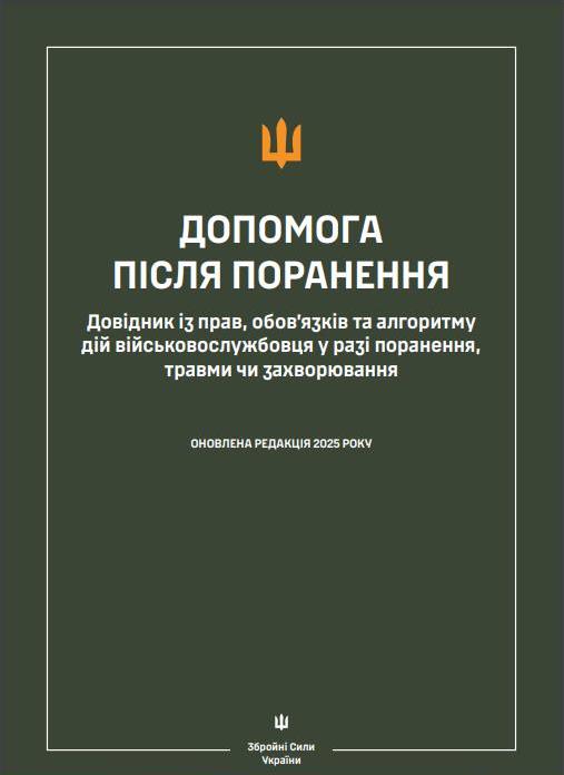 Довідник військовослужбовця після поранення слугує практичним посібником для бійців ЗСУ, поранених, травмованих чи хворих під час служби. Він детально описує алгоритми дій від першочергової допомоги (збереження первинної медичної картки №001) до взаємодії з частиною, лікуванням у різних закладах (військових, цивільних, приватних, вдома чи за кордоном), отримання довідки про обставини травми та проходження ВЛК. Довідник включає зразки рапортів, поради щодо виплат, документообігу, оскарження відмов та скарг, спрощуючи бюрократію для встановлення зв'язку з обов'язками. Довідник доступний у online-форматі та доступний до завантаження у форматі PDF.