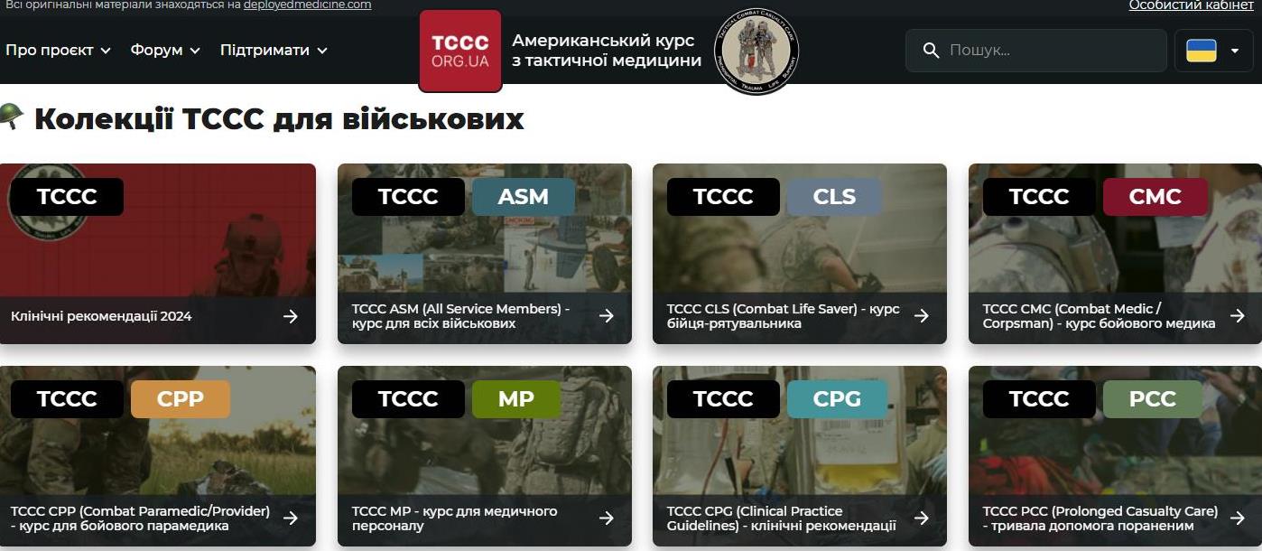 Сайт https://tccc.org.ua/ є офіційним українськомовним ресурсом з курсу Tactical Combat Casualty Care (TCCC) — стандарту тактичної медицини для надання допомоги пораненим у бою, адаптованим для ЗСУ за стандартами НАТО та Joint Trauma System США.