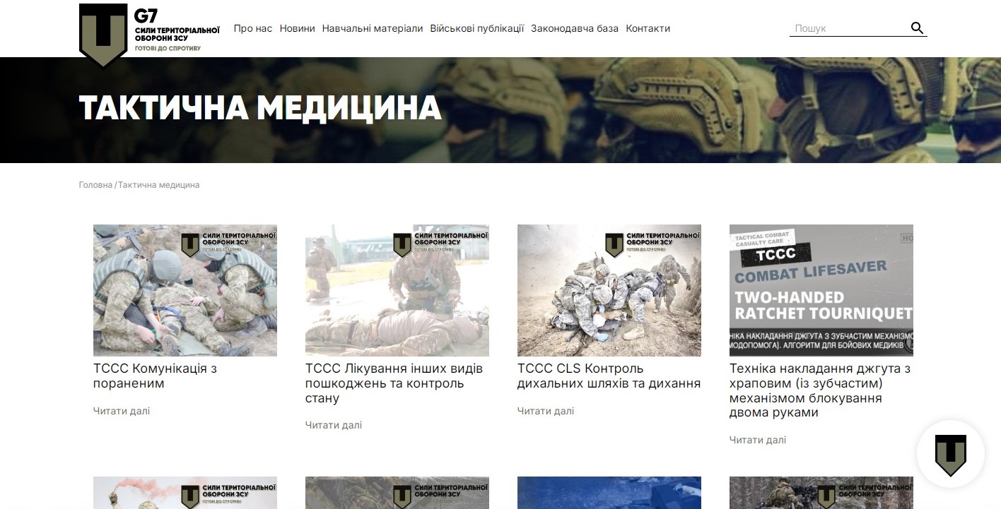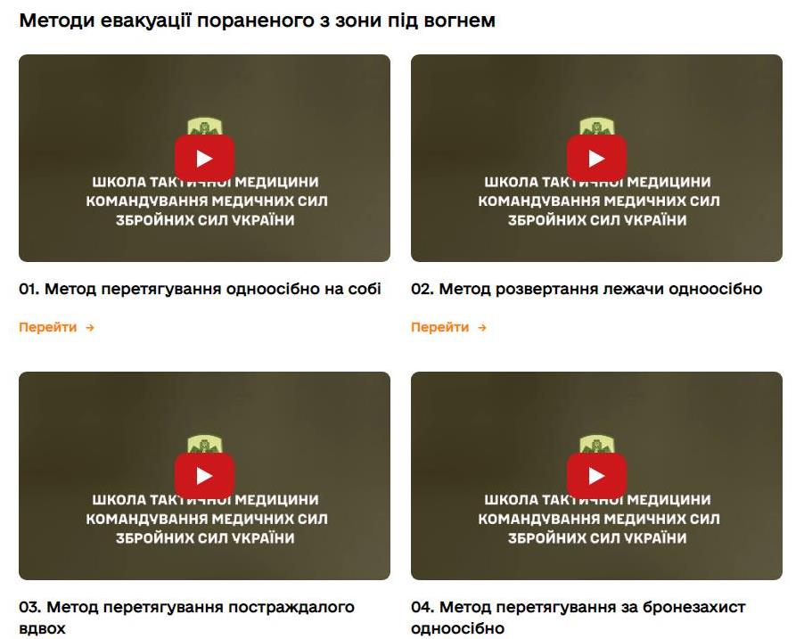 Уроки охоплюють турнікети (CAT, RMT, SAM, SICH, SOF-T, TMT) на етапі під вогнем, самодопомогу, 15 методів евакуації (одноосібно/вдвох/втрьох, стропи, бронежилет). Розділ доповнено матеріалами для бойових медиків та корисними ресурсами Сил ТРО ЗСУ.