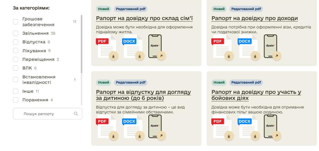 Зразки з рапортами є централізованою базою шаблонів документів для військовослужбовців ЗСУ з фільтрами за категоріями (грошове забезпечення, звільнення, відпустки, лікування, ВЛК, переміщення тощо). Вона містить готові зразки для ключових ситуацій: рапорт на вільну тему з чіткими вимогами оформлення (Times New Roman 12-14 pt, поля 30/10/20 мм, вирівнювання по ширині), звільнення від полону (для мобілізованих, офіцерів за призовом, кадровиків за ст. 26 Закону "Про військовий обов'язок"), лікарняний, виїзд за гарнізон, відпустку після полону, курси медичної служби в УВМА. Ресурс спрощує "рапорт по команді" з покроковими інструкціями подання через Армія+, наголошуючи на ієрархії візування та додатках (дипломи, згоди командира). Рапорти доступні до завантаження у форматах Word та PDF.